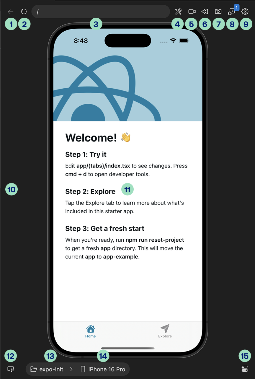 Reload button - reloads the JavaScript bundle from Metro bundler. Hovering over the reload button reveals an arrow which allows for more granular reload options like: